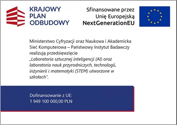 Projekt realizowany jest w ramach Krajowego Planu Odbudowy i Zwiększenia Odporności, którego celem jest rozwój nowoczesnej edukacji cyfrowej, wykorzystującej innowacyjne technologie, w tym sztuczną inteligencję, w codziennym procesie nauczania.